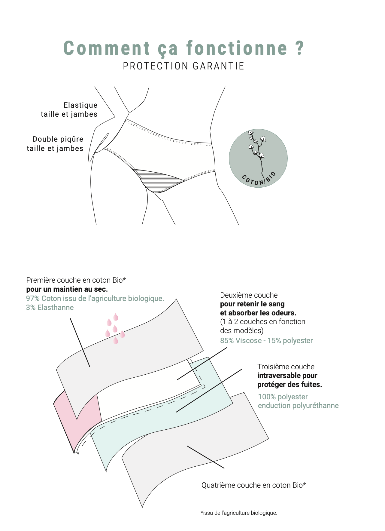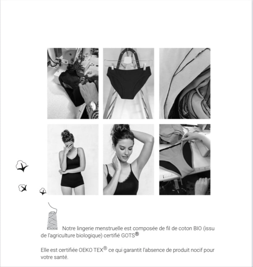 Hergestellt in Frankreich mit Sorgfalt und Gewissen. Wir verwenden ausschließlich GOTS®-zertifizierte Bio-Baumwolle, die ohne Pestizide angebaut wird und somit haut- und umweltfreundlich ist. Dieser weiche und atmungsaktive Stoff eignet sich perfekt für den Intimbereich, selbst für die empfindlichsten, und bietet Ihnen Komfort, Sicherheit und Vertrauen – Tag und Nacht.