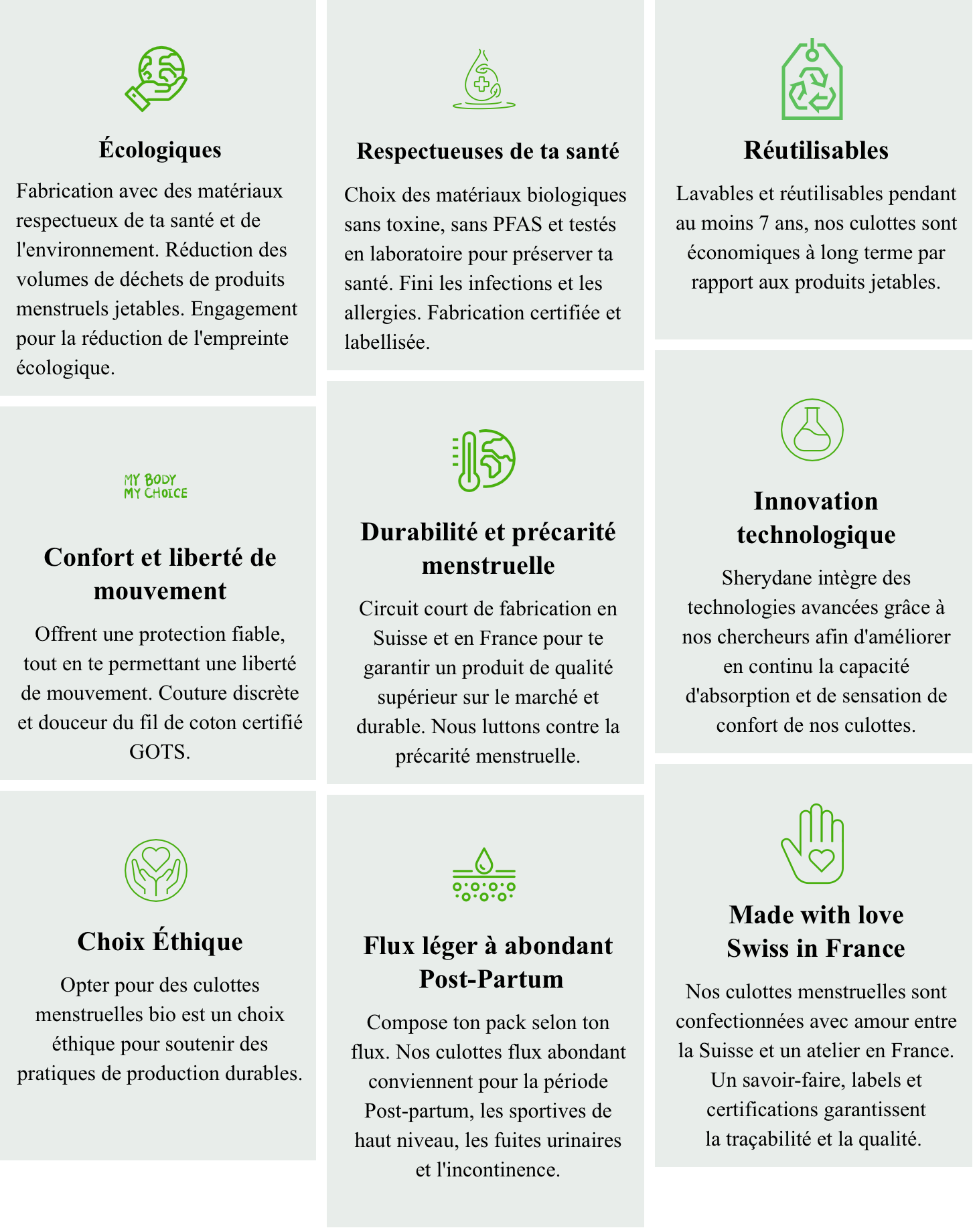 Wohlbefinden und Menstruationsgesundheit bieten gesunden Schutz für alle Frauen von 10 bis 99 Jahren: Teenager, moderne gesundheitsbewusste Frauen, junge Mütter, Frauen in den Wechseljahren, Sportlerinnen und mehr. Sherydane hat Produkte entwickelt, die gesund für Ihren Körper, nachhaltig und umweltfreundlich sind – zum Wohle des Planeten. Sherydane kombiniert Bio-Produkte mit lokaler, ethischer Herstellung in Frankreich und ist nach OEKO-TEX Standard 100 zertifiziert, frei von Giftstoffen, PFAS und endokrinen Disruptoren. Wir bieten Ihnen kompromisslosen Komfort und Stil, damit Sie Ihren Zyklus in völliger Freiheit leben können. Denn Ihre Periode oder Ihr Harninkontinenz sollten niemals eine Belastung, sondern eine Stärke sein.